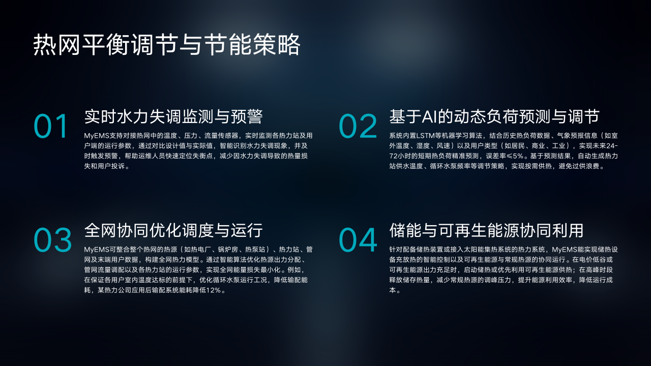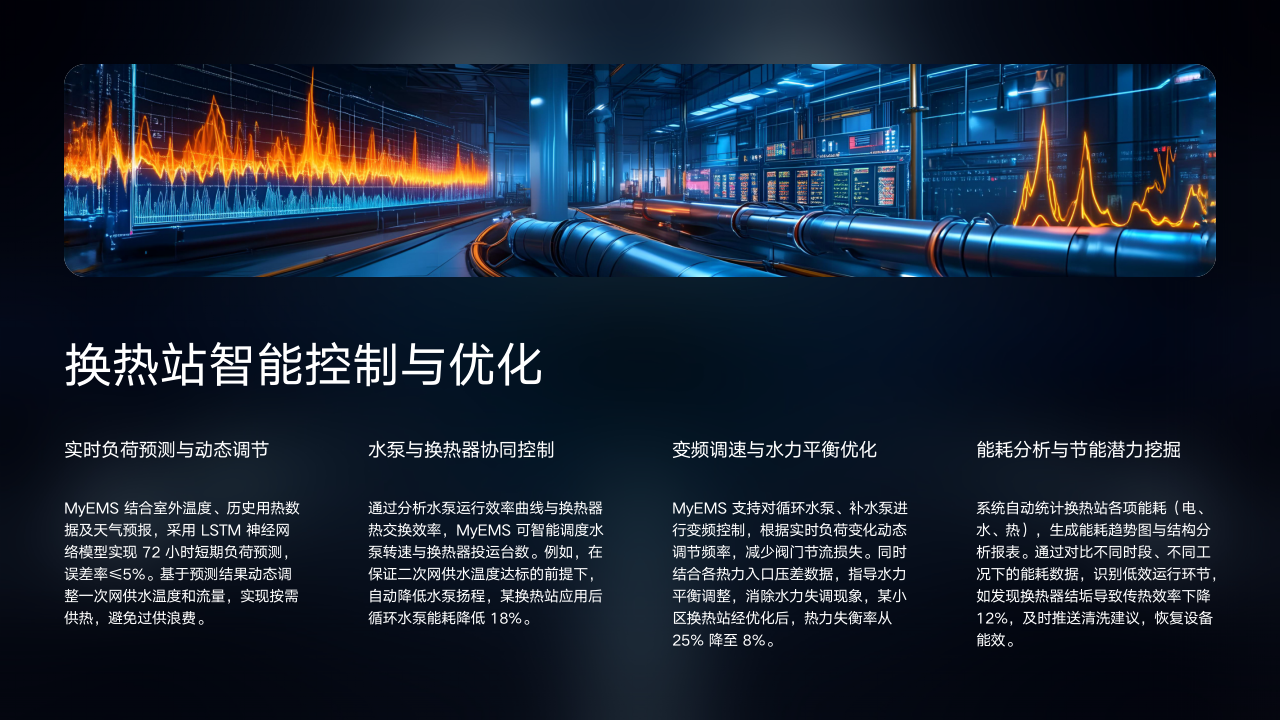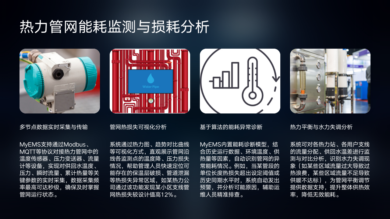 其三是全网协同优化调度与运行,MyEMS整合热网各环节数据构建全网热力模型,借助智能算法优化热源出力、管网流量及热力站运行参数,实现全网能量损失最小化。如某热力公司应用后输配系统能耗降低12%。