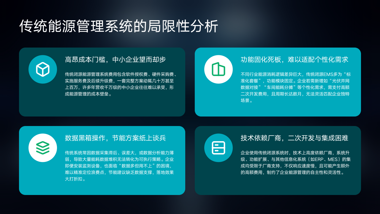 技术依赖厂商,二次开发与集成困难。企业使用传统闭源系统时,技术上高度依赖厂商,系统升级、功能扩展、与其他信息化系统(如ERP、MES)的集成均受限于厂商支持。这不仅响应速度慢,还可能产生额外高额费用,制约了企业能源管理的自主性和灵活性。