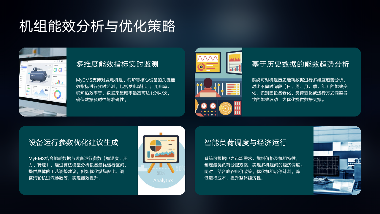MyEMS在机组能效分析与优化方面具备全面且强大的功能。首先是多维度能效指标实时监测,系统支持对发电机组、锅炉等核心设备的关键能效指标进行实时监测,涵盖发电煤耗、厂用电率、锅炉热效率等。高达1分钟/次的数据采集频率,确保了数据的及时性与准确性,为后续分析提供坚实基础。