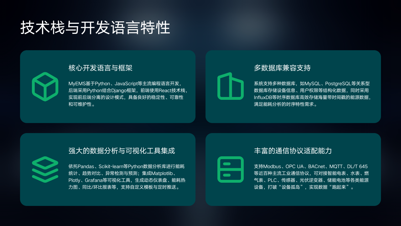 MyEMS系统是基于开源技术栈构建的企业级能源管理系统,旨在为各类企业、公共建筑、工业园区等提供全流程能源数据采集、监控、分析、优化及决策支持服务,以实现能源消耗的精细化管理与高效利用。