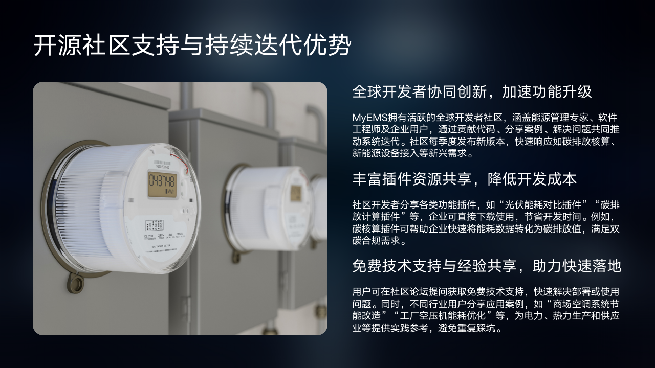 全球开发者协同创新加速了MyEMS的功能升级。其活跃的全球开发者社区汇聚了能源管理专家、软件工程师和企业用户,大家通过贡献代码、分享案例和解决问题,共同推动系统迭代。社区每季度发布新版本,能快速响应碳排放核算、新能源设备接入等新兴需求,确保MyEMS始终紧跟行业发展步伐。