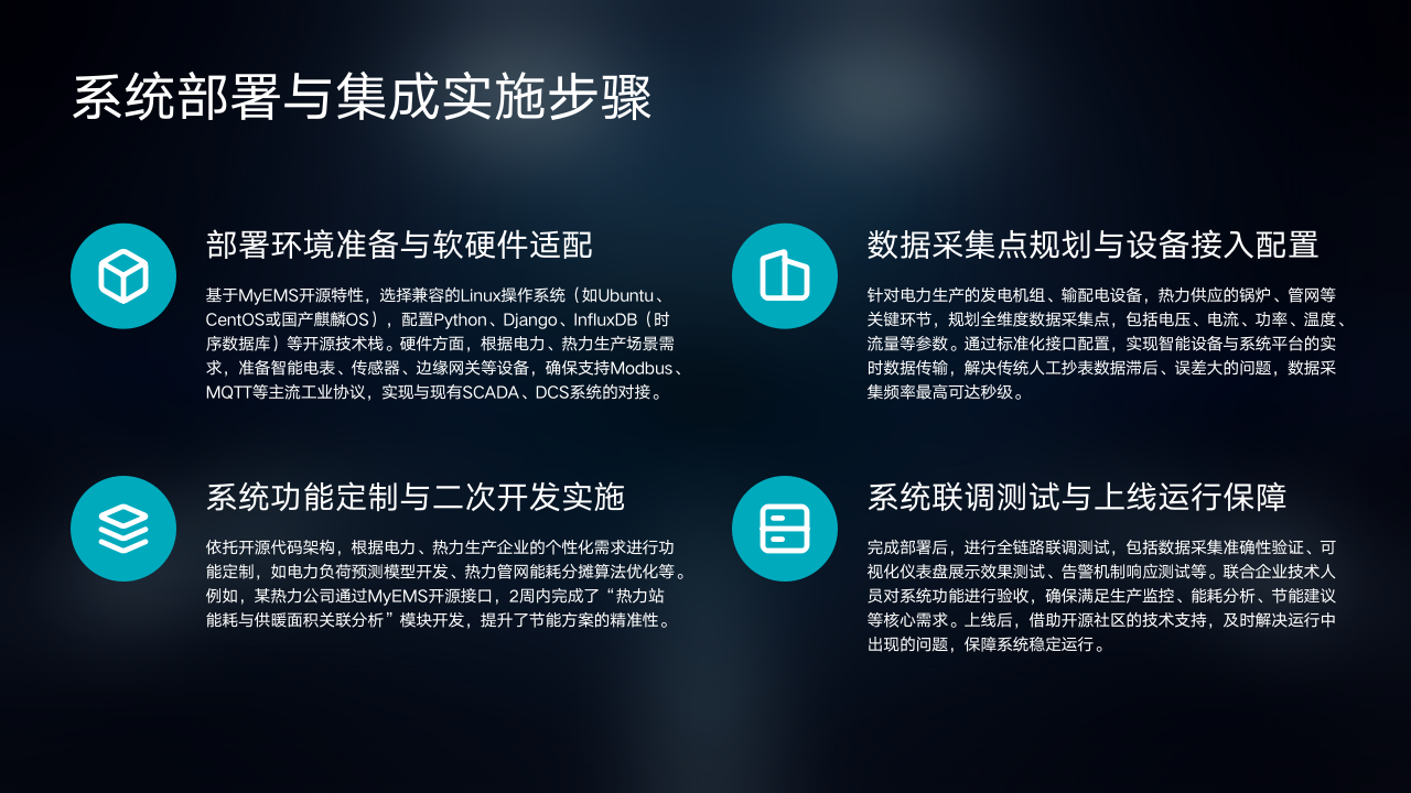 MyEMS系统的部署与集成实施步骤包含四个关键环节,确保了系统在电力、热力生产企业中的高效落地。