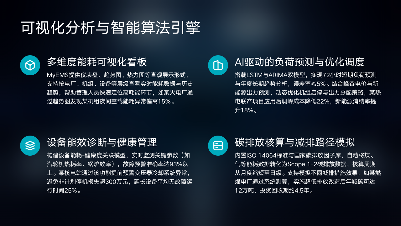 异常能耗预警与故障诊断机制设定了设备能耗阈值与运行参数基线,当检测到异常情况时,系统会自动触发告警,并结合设备运行日志与AI诊断模型初步判断故障原因,可有效避免设备故障和能源浪费,如某电厂提前预警锅炉燃烧异常,避免了月均超排150吨二氧化碳。