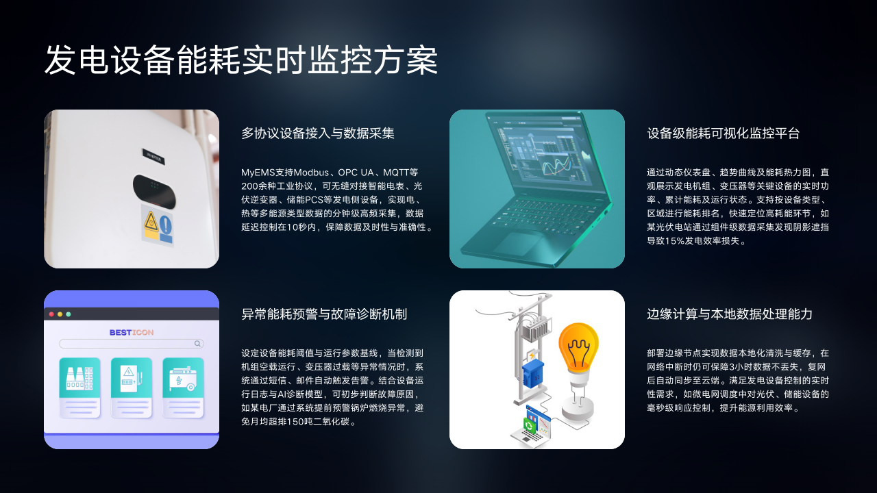 前面我们了解了MyEMS的技术架构、核心能力及相关功能模块。现在,我们将目光聚焦到电力生产行业。本章节的电力生产行业解决方案,是MyEMS在实际行业中的具体应用呈现。接下来,让我们一同探究它在发电设备监控、机组能效优化等方面的具体方案。