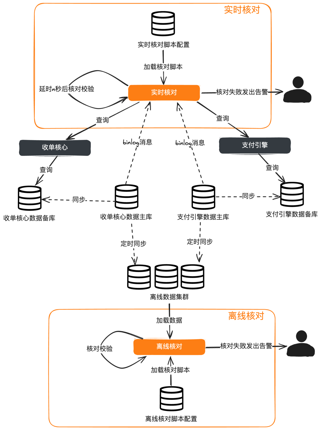 离线对账一般就是把生产数据库的数据定时清洗到离线库(一般还可以分为天表和小时表),然后进行对账。