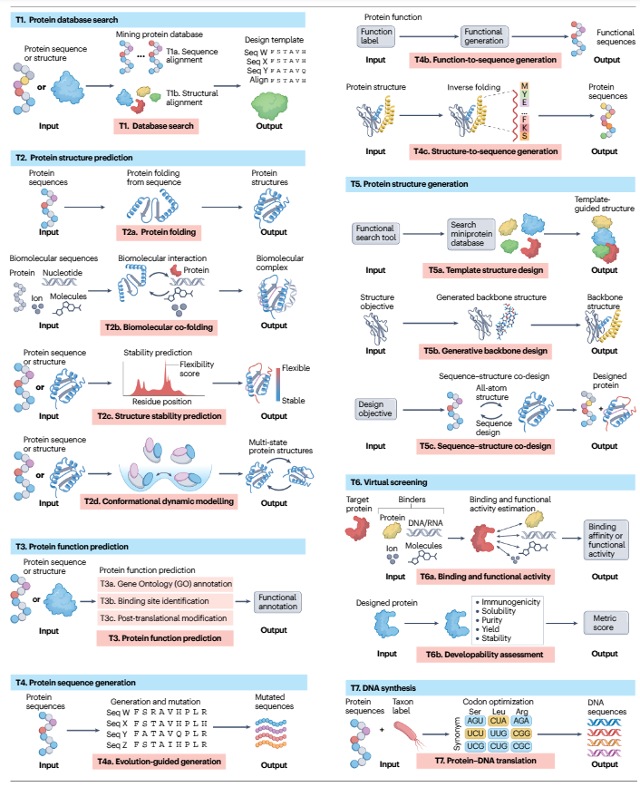 这篇综述最牛的地方,就是把五花八门的AI工具整理成了一个系统化的"工具箱"。我把它理解为蛋白质设计的"七种武器",每种武器下面还有更细分的"招式"。