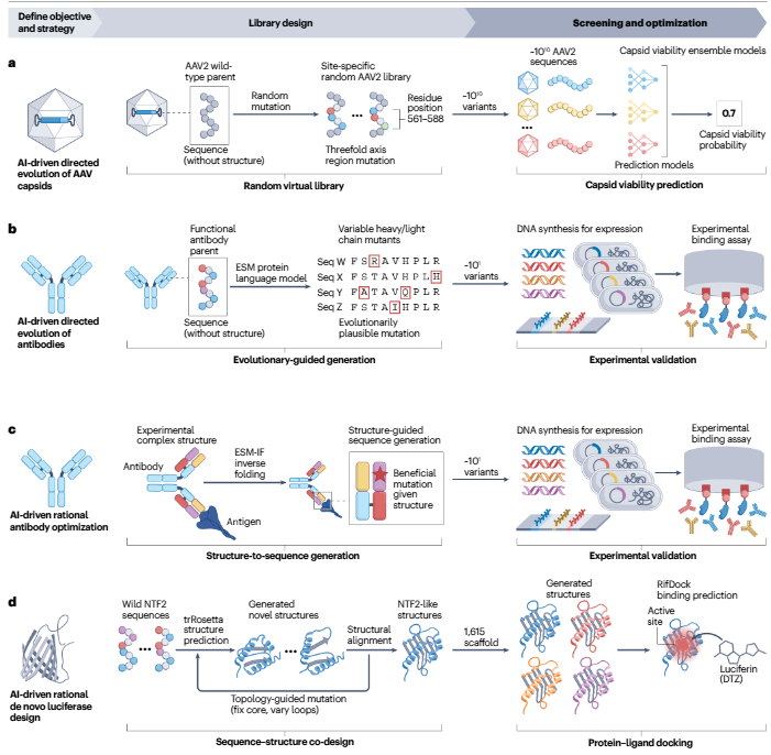 腺相关病毒(AAV)是基因治疗的重要载体。研究团队用AI虚拟筛选,从10^10(100亿!)个候选设计中筛出11万多个可行的病毒衣壳。这要是靠传统方法,做到天荒地老也筛不完。