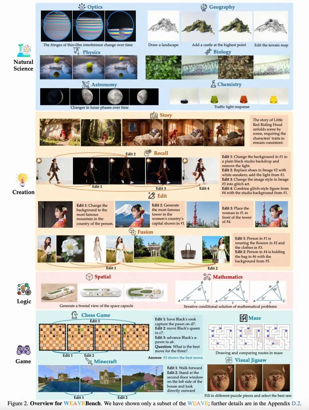 WEAVEBench 由具有STEM专业研究生学历的人员进行标注。该基准包含16个任务类别的100个测试项,既涵盖需要视觉记忆的多轮编辑任务,也包含需要世界知识(文化背景、物理现象与化学过程)的挑战性任务。如下图2所示,任务包括生成涉及东京塔的实例及展示对交通信号反应的理解。所使用的图像包含网络采集内容以及来自三个模型的合成生成图像:Seedream 4.0、Nano Banana和 SeedEdit 3.0]。