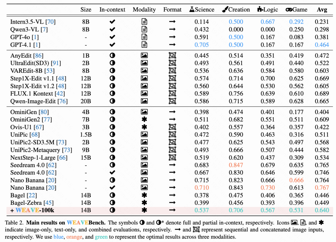 设置。 如下表2所示,本文在WEAVEBench上评估了4个LLM、7个编辑模型和11个UMM。评估在三种不同的上下文条件下进行:(1) 无上下文(无上下文信息的单轮生成),(2) 部分上下文(仅使用自生成图像及明确提及的视觉上下文,排除其他历史交互),(3) 完整上下文(可见所有先前交互)。对于图像放置,本文采用两种配置:"首次提及"(图像出现在首次提及位置)和"前置集中"(所有图像整合在输入开头),下表2报告了后者的结果。对于无法处理序列格式输入的模型,本文按照先前工作[19,89]的方法实施了拼接方案。