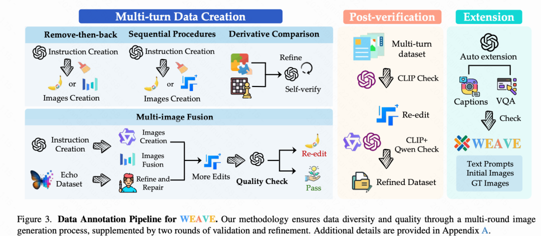 WEAVE-100k 为生成具备视觉记忆能力的丰富多样数据,本文构建了如下图3所示的数据流水线。该流水线包含四条独立生成路径,并经过多轮过滤优化阶段以确保数据准确性与质量。为生成具有视觉记忆能力的多轮编辑数据,本文实施了四种方法路径:(i) 多图像融合:通过融合编辑后或直接生成的图像实现历史迭代参照;(ii) 移除后复原:采用先移除/替换对象再重新添加的技术,使系统能够回忆先前删除的视觉元素;(iii) 衍生想象与比较:在融合前引入推导替代方案或生成新图像的衍生方法;(iv) 序列化流程:按照叙事进程或结构化编辑操作实施序列化编辑。