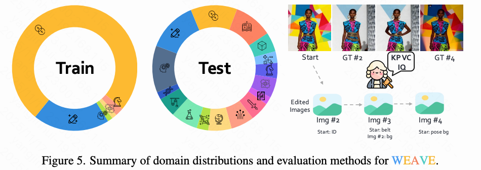 对于WEAVE中的每个实例,本文提供文本提示、一张或多张初始图像以及真实示例。测试集还包含正确输出图像必须满足的关键信息。