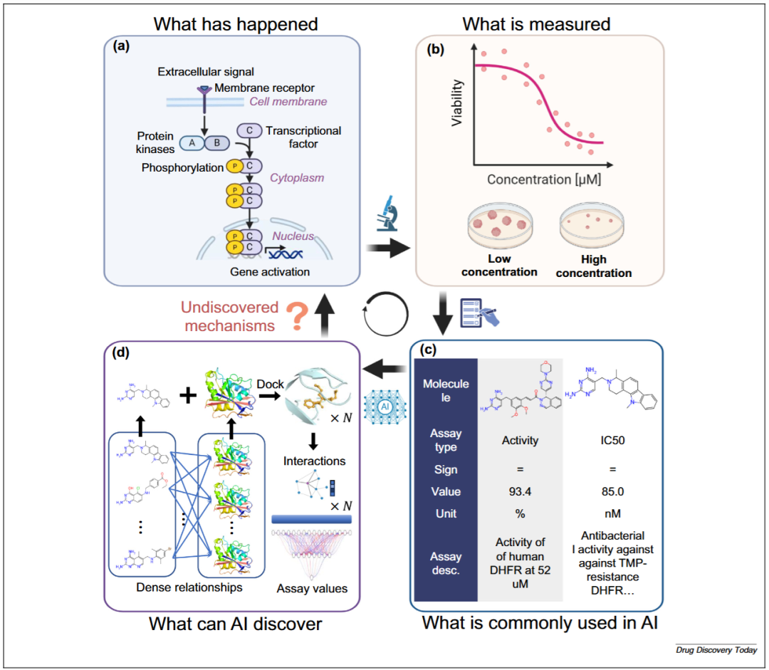 图2展示了传统生物活性测量方式、AI应用中常用的简化指标以及药物发现中更深层次的生物机制之间的脱节。标准化的生物活性数值(如IC₅₀或EC₅₀)在数据集中占据主导地位,如ChEMBL与PubChem数据库。这些指标虽然在基准评估与对比分析中极具价值,但它们往往无法反映实验条件的复杂性,或药物效应背后错综复杂的分子相互作用。诸如实验类型、实验操作流程、细胞背景以及分子环境等因素,都可能显著影响生物活性测量结果,但在这些标准化数值中很少被考虑或保留。