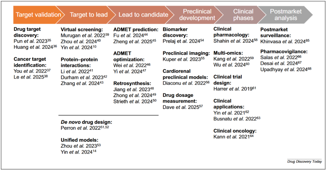 研究团队对药物发现流程各阶段的AI应用进行了系统性梳理,涵盖了从靶点发现到临床前研究的最新、综合性与开创性研究(图3),凸显出当前AI方法的碎片化特征。多数模型被设计用于解决单一、独立的任务,而非为整个药物发现流程提供系统化、集成化的解决方案。这种碎片化的问题尤其突出,因为药物发现是一个高度迭代且相互关联的过程,而下游阶段的失败往往未在早期建模阶段得到充分考虑。