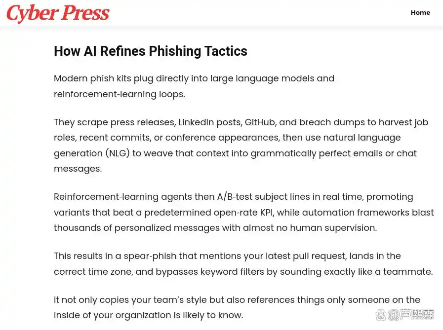 综上,AI钓鱼已从“广撒网”转向“精准狙击”,其核心优势在于上下文感知、风格一致性、多模态融合与自动化迭代,这使得传统基于规则或签名的防御机制难以奏效。