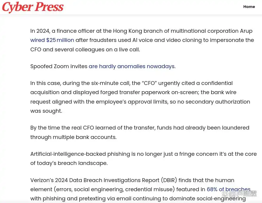 除文本外,AI语音合成(如ElevenLabs)和深度伪造视频(如DeepFaceLab)已被用于实时会议欺骗。攻击者可录制目标高管数分钟的公开演讲视频,生成其语音和面部表情的数字孪生体,在Zoom或Teams会议中冒充其身份。结合屏幕共享伪造的银行转账界面,形成闭环欺骗链。