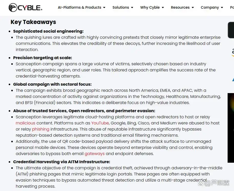 与传统链接钓鱼不同,二维码钓鱼(Quishing)的核心优势在于其视觉不可解析性与跨设备跳转能力。用户无法直接判断二维码指向的URL是否合法,且扫描行为通常发生在受企业安全策略管控较弱的个人手机上,使得攻击面从受保护的企业邮箱延伸至无管理的移动终端。此外,“Scanception”活动还系统性地滥用YouTube、Google、Cisco、Medium等高信誉平台的开放重定向功能,进一步混淆流量来源,逃避基于域名信誉的过滤机制。
