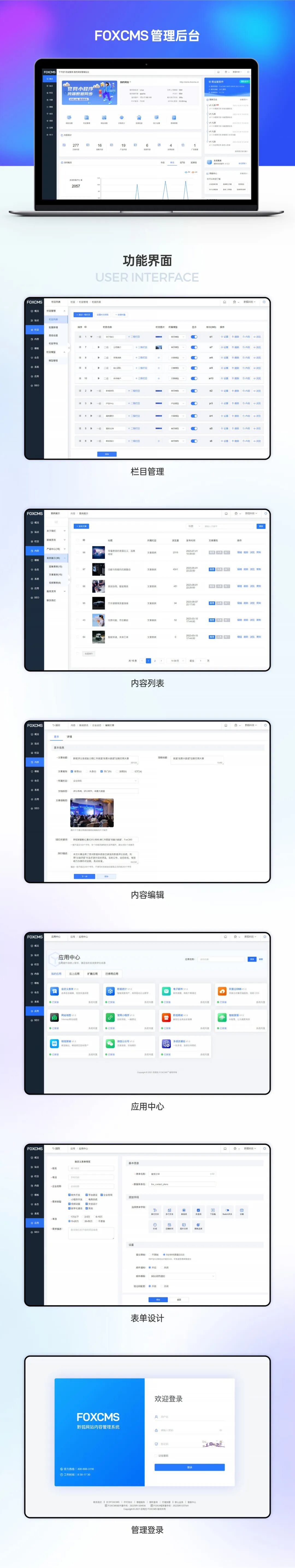 FoxCMS是一套可免费商用开源的内容管理系统,采用PHP+MySQL架构。内置企业常用的内容模型,如单页、文章、产品、图集、视频、反馈、下载等,并配备丰富的模板标签及强大的SEO和伪静态优化机制。无需复杂编程技能,仅需掌握HTML即可快速构建出多元化的应用场景,实现内容的高效管理。系统支持多语言、表单设计、访客统计、消息通知、云存储服务等,更多应用插件持续上架中,欢迎大家提出宝贵意见和建议。