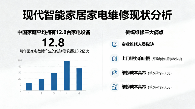 在现代智能家居环境中,家电设备的复杂性与日俱增。据统计,中国家庭平均拥有12.8台家电设备,每年因家电故障产生的维修需求超过3.2亿次。然而,传统维修模式面临三大痛点:专业维修人员稀缺、上门服务响应慢(平均等待时间48小时)、维修成本高昂(单次平均280元)。