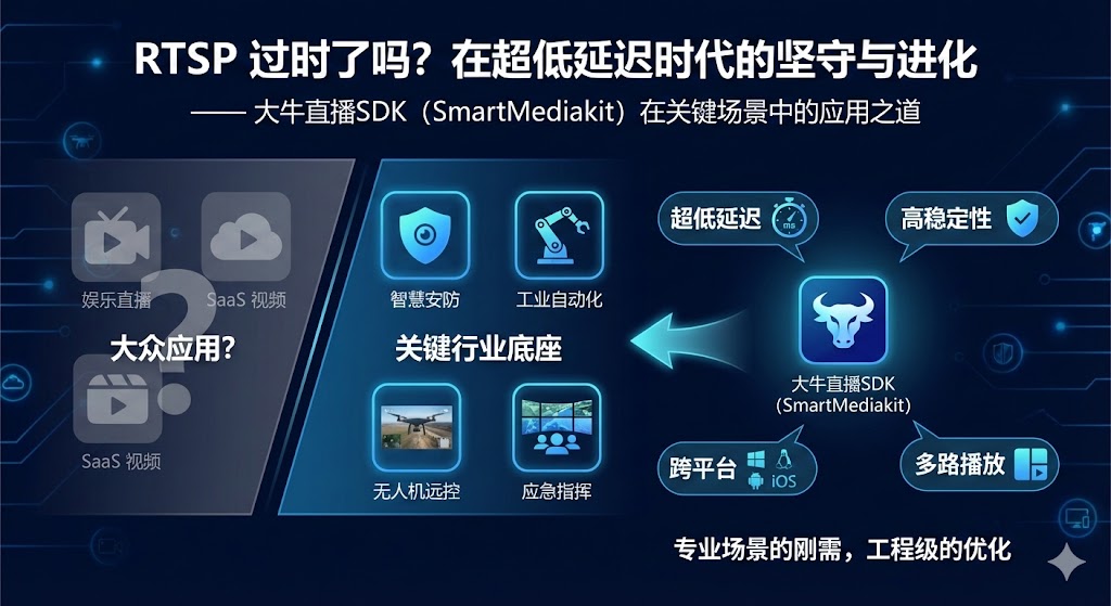 而像大牛直播SDK(SmartMediakit)这种面向行业的专业 SDK,正是在不断打磨 RTSP 在这些“关键应用场景”中的表现,通过更稳、更快、更兼容、更容易集成的特性,让这个诞生于上世纪的协议在今天依旧发挥关键作用。