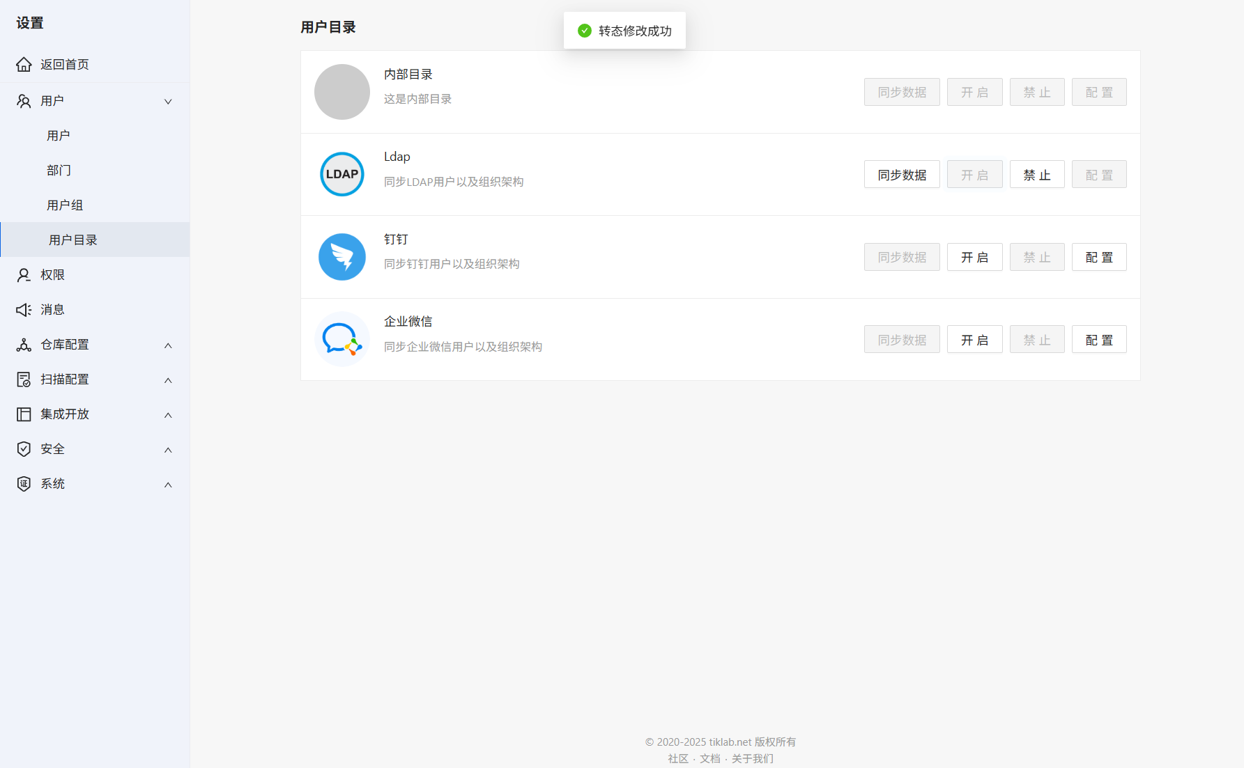 配置成功后点击开启,此时同步数据的按钮会亮起,点击同步数据,就会把LDAP下的用户信息同步到Hadess。
