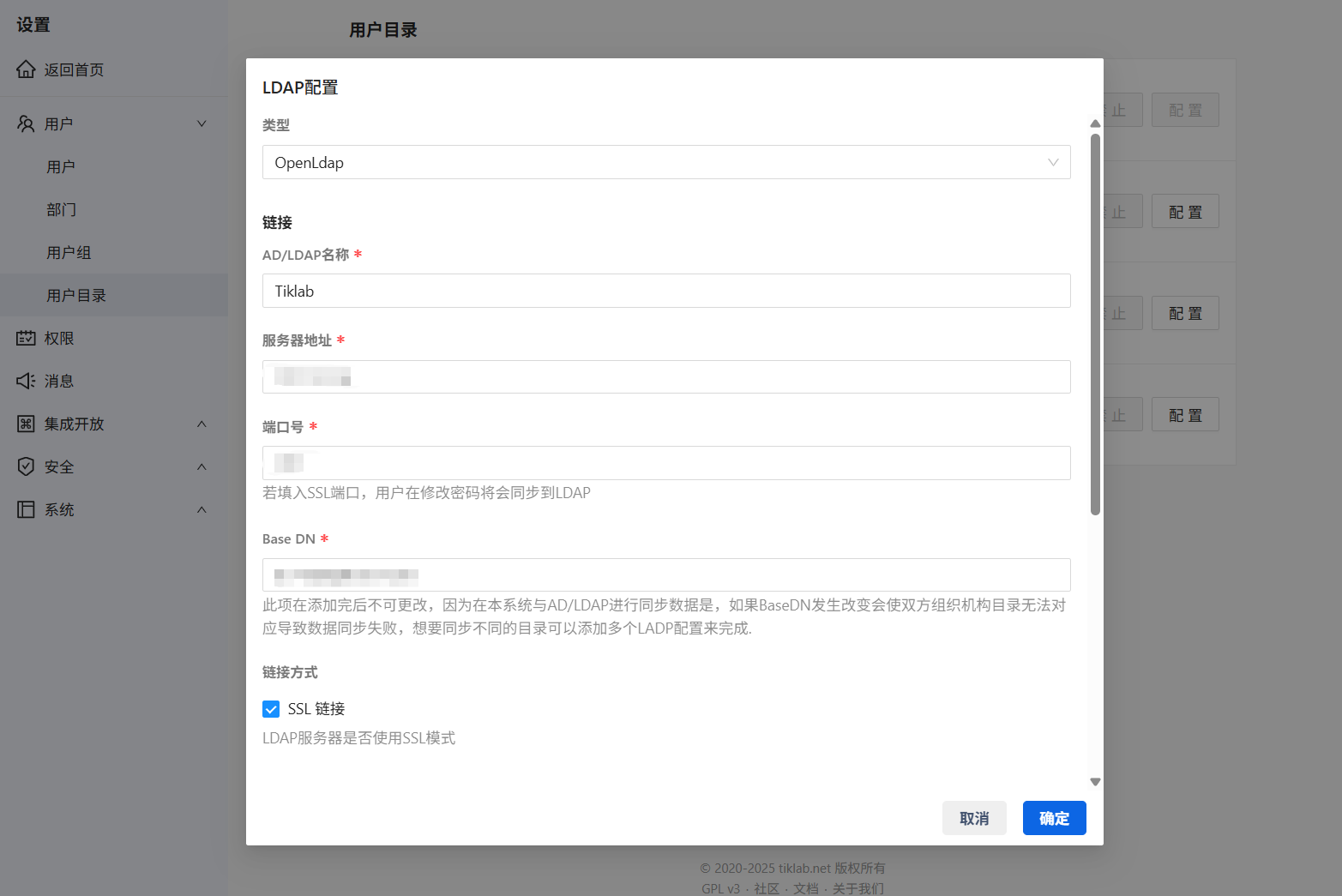 链接方式 | LDAP服务器是否使用SSL模式,默认为启动 |