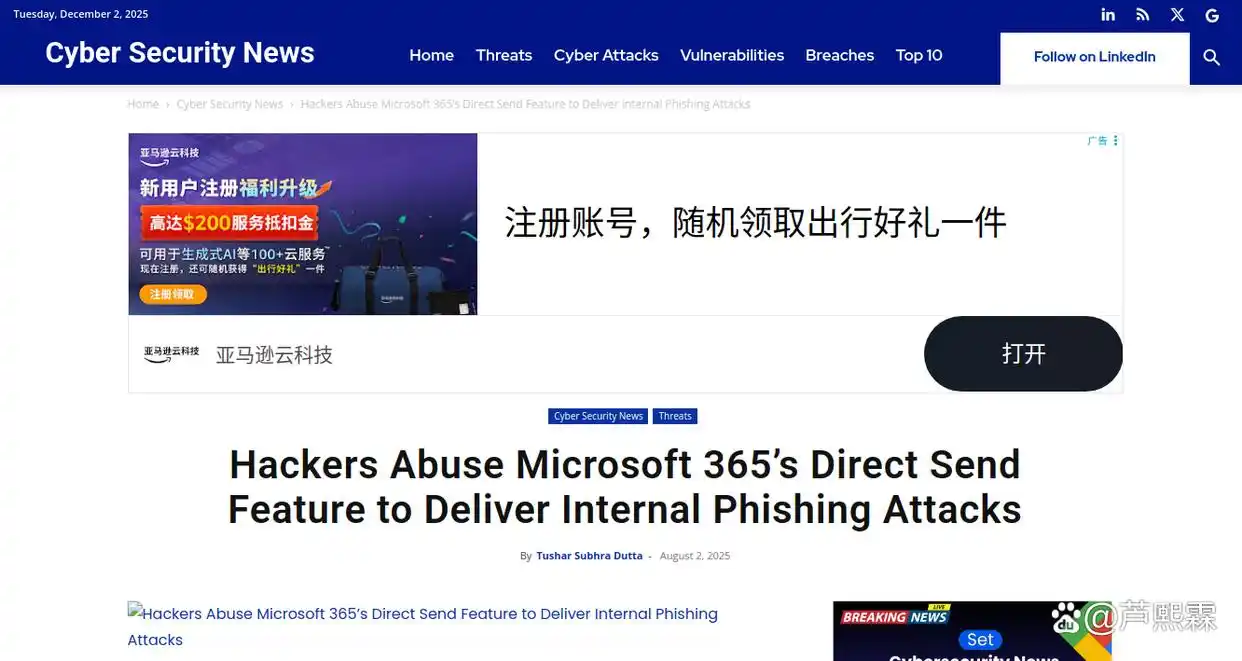 关键词:Microsoft 365;Direct Send;内部钓鱼;邮件伪造;云安全;SMTP中继