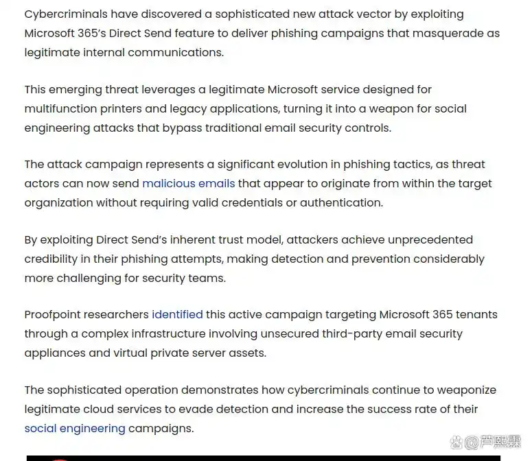 2025年8月,Proofpoint等安全厂商披露了首起大规模利用Direct Send实施内部钓鱼攻击的事件。攻击者通过控制第三方邮件安全设备,伪装成合法内部发件人,向目标租户投递包含恶意链接或附件的邮件。由于邮件未经过外部网关扫描,且发件地址属于组织域名,传统反钓鱼规则难以识别,导致攻击成功率显著提升。
