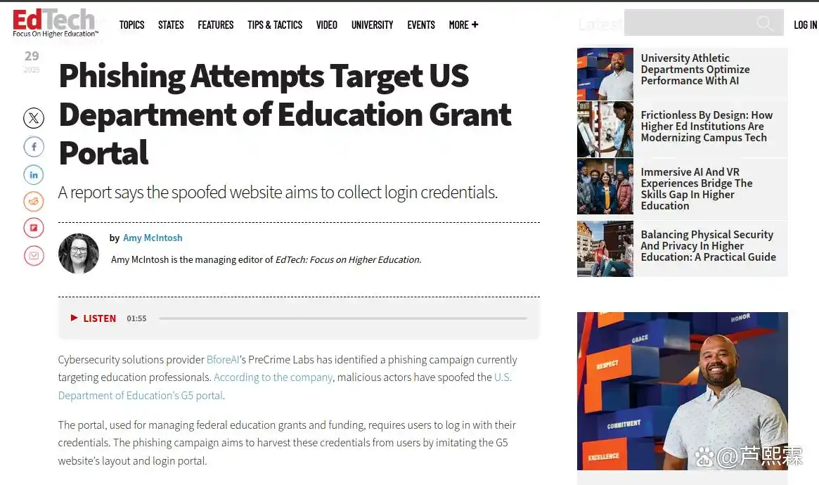 此类攻击并非孤立事件。据EDUCAUSE 2024年安全报告显示,教育机构遭受的钓鱼攻击同比增长67%,其中针对财务与资助系统的攻击占比达38%。然而,现有研究多聚焦于通用钓鱼检测或学生数据泄露,对面向政府-教育协同平台的定向钓鱼缺乏深度技术解构。本文旨在填补这一空白,从攻击建模、检测盲区到防御闭环进行系统性论述,避免泛泛而谈,确保技术细节准确、对策可执行。