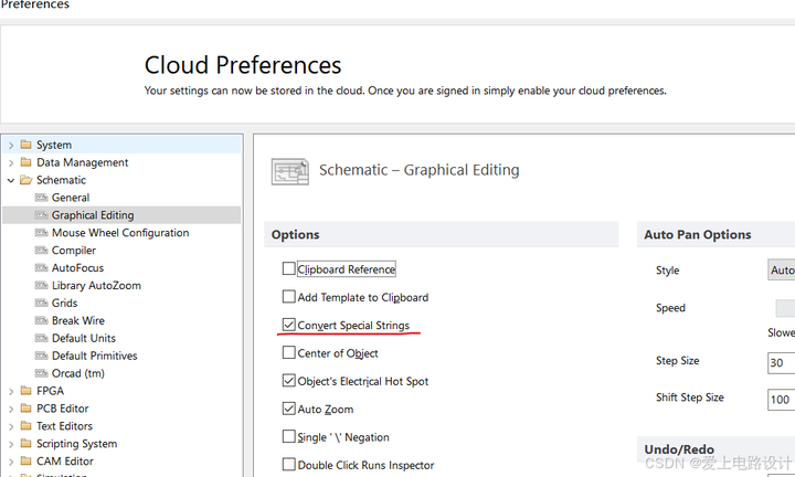 就以它的原生模板为例,首先 Tools → Schematic Preferences → Graphical Editing,将 Convert Special Strings 上的勾去除。