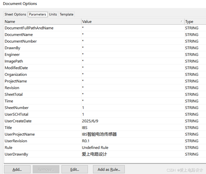 新建一个原理图文件,进入 Design → Document Options,并在第二项 Parameters 中添加 UserCreateDate,并在后面的文本中输入我们想要的内容,比如 2025/6/9: