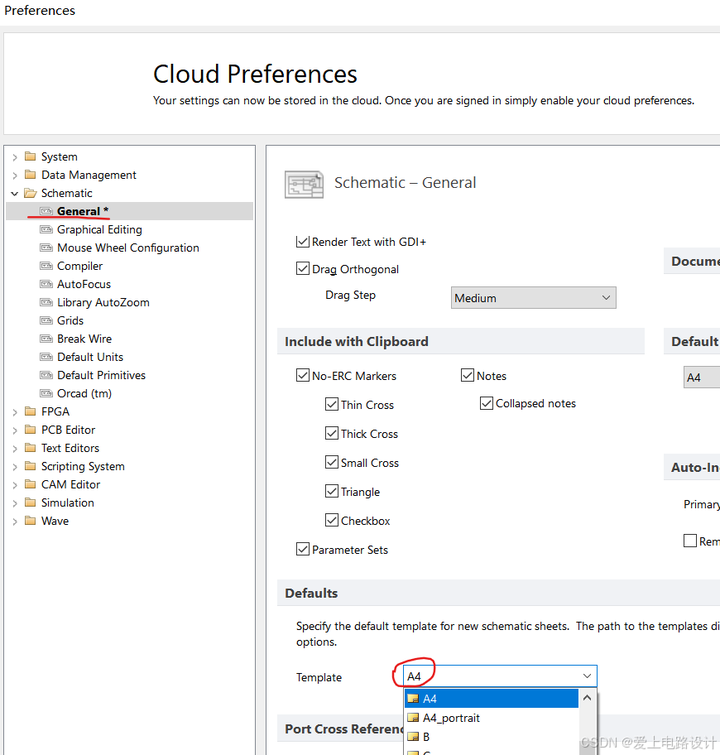 下面我们来看看效果,先进入 Tools > Schematic Preferences > General 选择刚刚建立的模板: