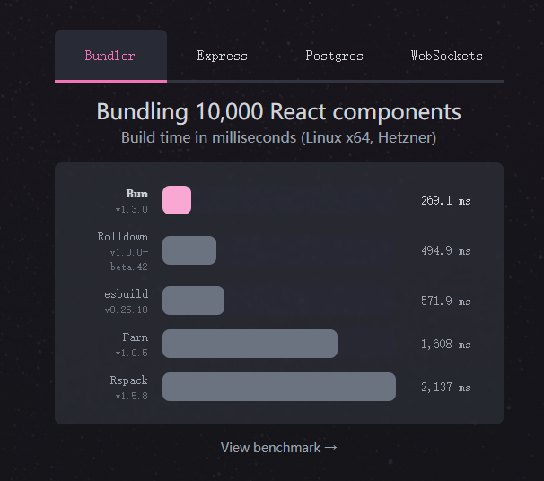 统一的开发体验:Bun 是一个用于构建 JavaScript 应用的完整工具包,包括一个软件包管理器、测试运行器和打包工具。