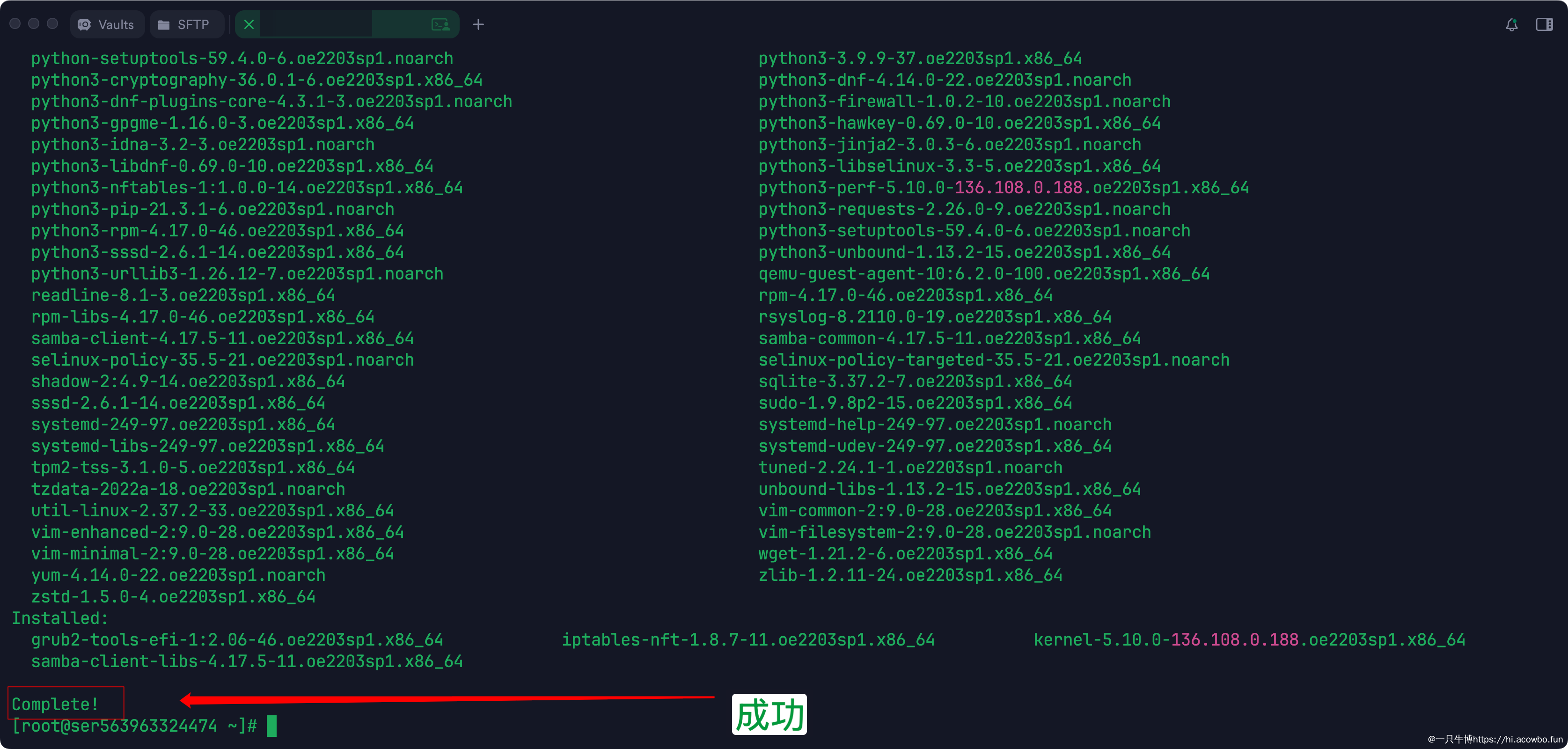 更新过程大概花了3-5分钟,系统下载并安装了一些更新包。从截图可以看到更新命令执行完成,提示"Complete!",说明系统已经是最新状态了。