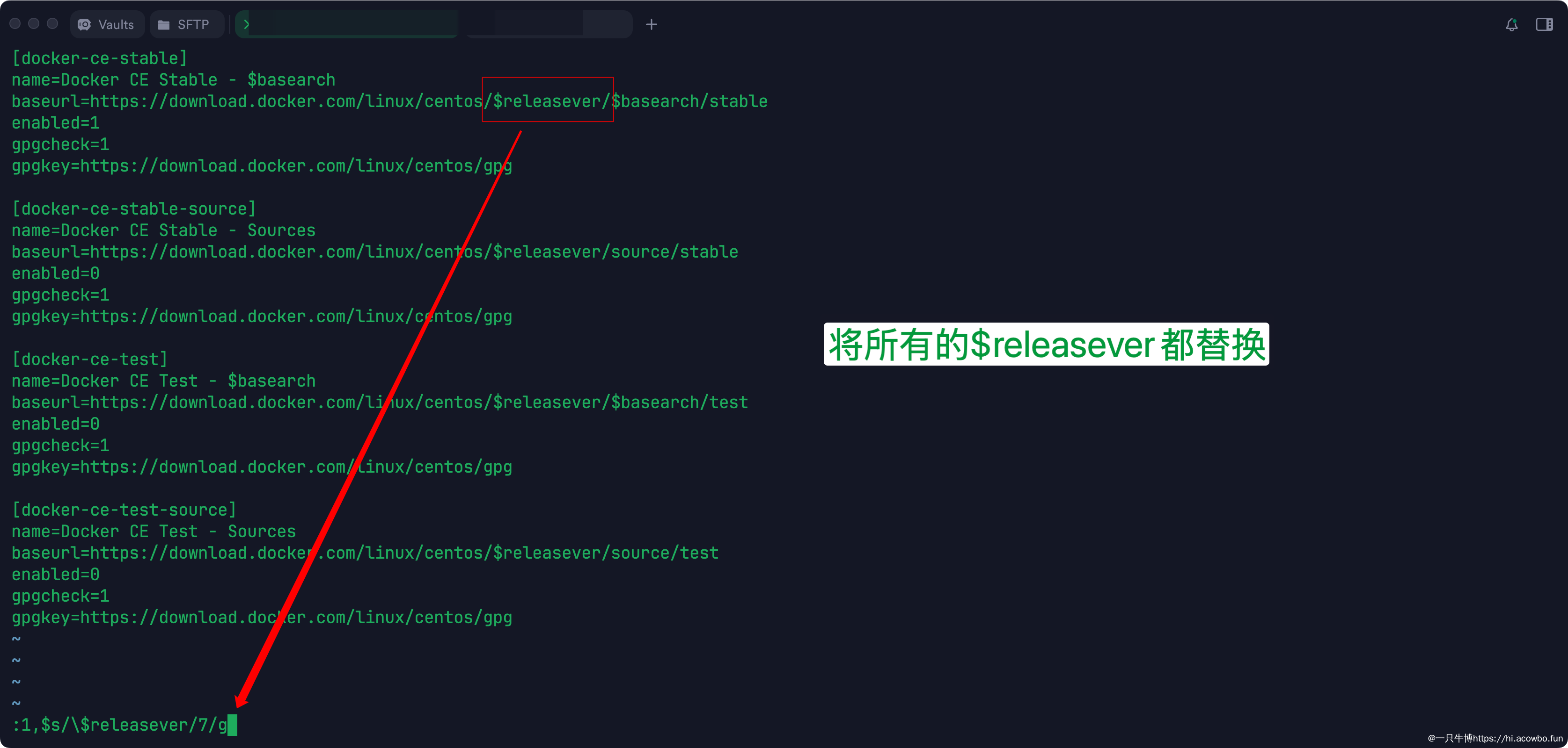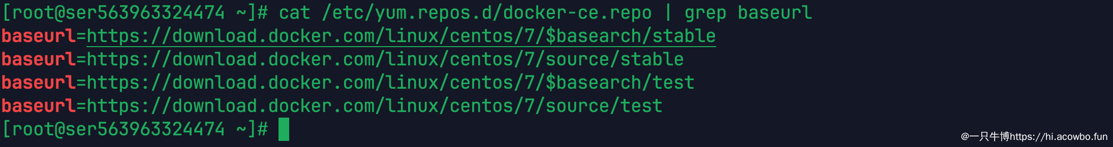 sudo sed -i 's/\$releasever/7/g' /etc/yum.repos.d/docker-ce.repo替换完成后,验证一下修改是否生效: