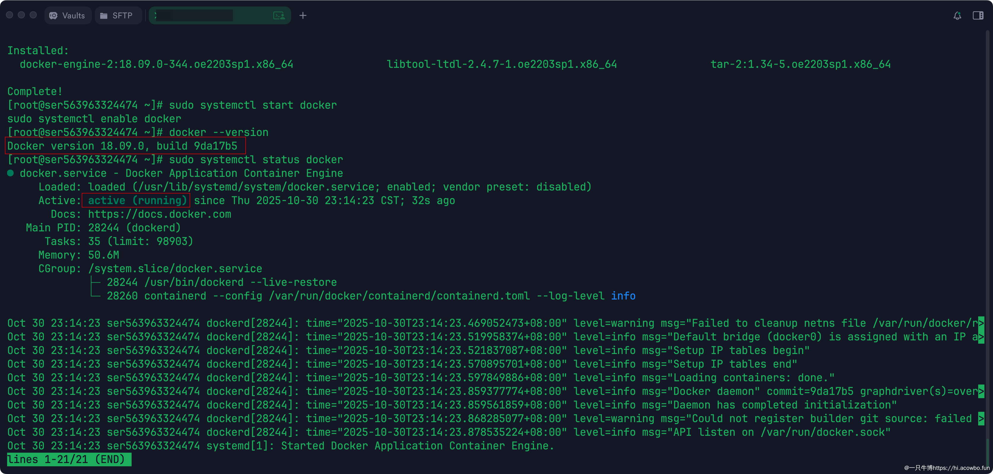 完美!Docker 已经升级到 26.1.4 版本了,这是一个比较新且稳定的版本。同时可以看到 Docker 服务状态是 active (running),说明服务已经正常启动了。
