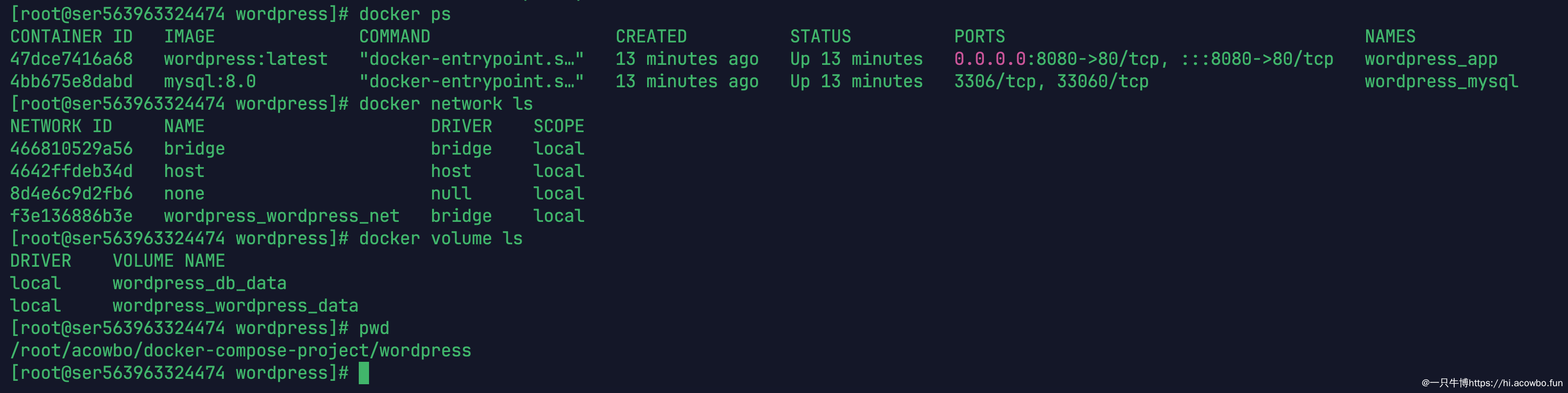 从截图可以看到,项目目录创建好了,当前路径是 /root/acowbo/docker-compose-project/wordpress。这种层级化的目录结构可以更好地组织不同的 Docker Compose 项目。接下来在这个目录里创建 Docker Compose 配置文件。