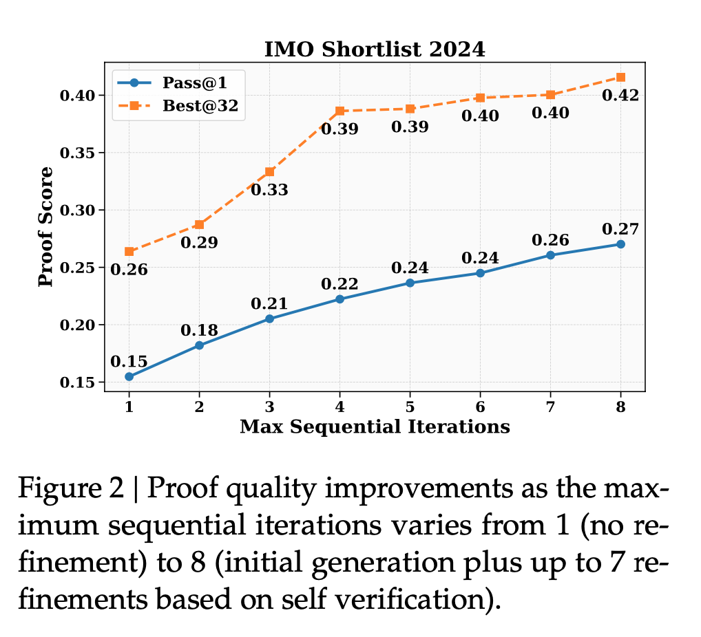 图 2 展示了通过顺序改进在 IMO Shortlist 2024 问题上的证明质量提升。对于每个问题,我们启动了 32 个独立的改进线程。证明正确性通过我们最终验证器的 32 个验证分析的多数投票来衡量。我们在图 2 中报告了两个指标:(1) Pass@1——每个线程最终证明的平均分数,以及 (2) Best@32——每个问题中自我评分最高的证明的分数,该证明是根据所有线程的自我评分选出的。自我选择的最佳证明获得了比线程平均水平高得多的验证分数,证明了我们的生成器准确评估证明质量的能力。此外,随着最大顺序尝试次数的增加,Pass@1 大幅提高,表明自我验证有效地指导了迭代改进。这些结果证实,我们的生成器可以可靠地区分高质量证明和有缺陷的证明,并利用这种自我意识系统地提高其数学推理能力。