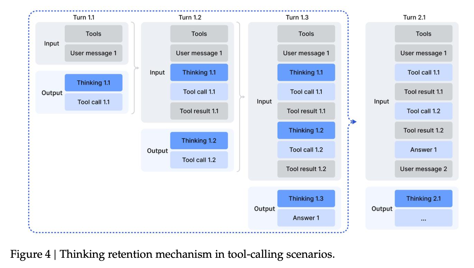 该流水线首先通过“冷启动”(cold-start)阶段统一模型的推理与工具使用能力,随后进入大规模合成阶段,生成了超过1800个不同的环境和85000个复杂的提示。这些高质量、大规模的合成数据为强化学习提供了丰富且多样的训练素材,使得 DeepSeek-V3.2 在此前未见过的智能体任务中表现出卓越的泛化能力,成功在智能体领域大幅缩小了与闭源模型的差距。
