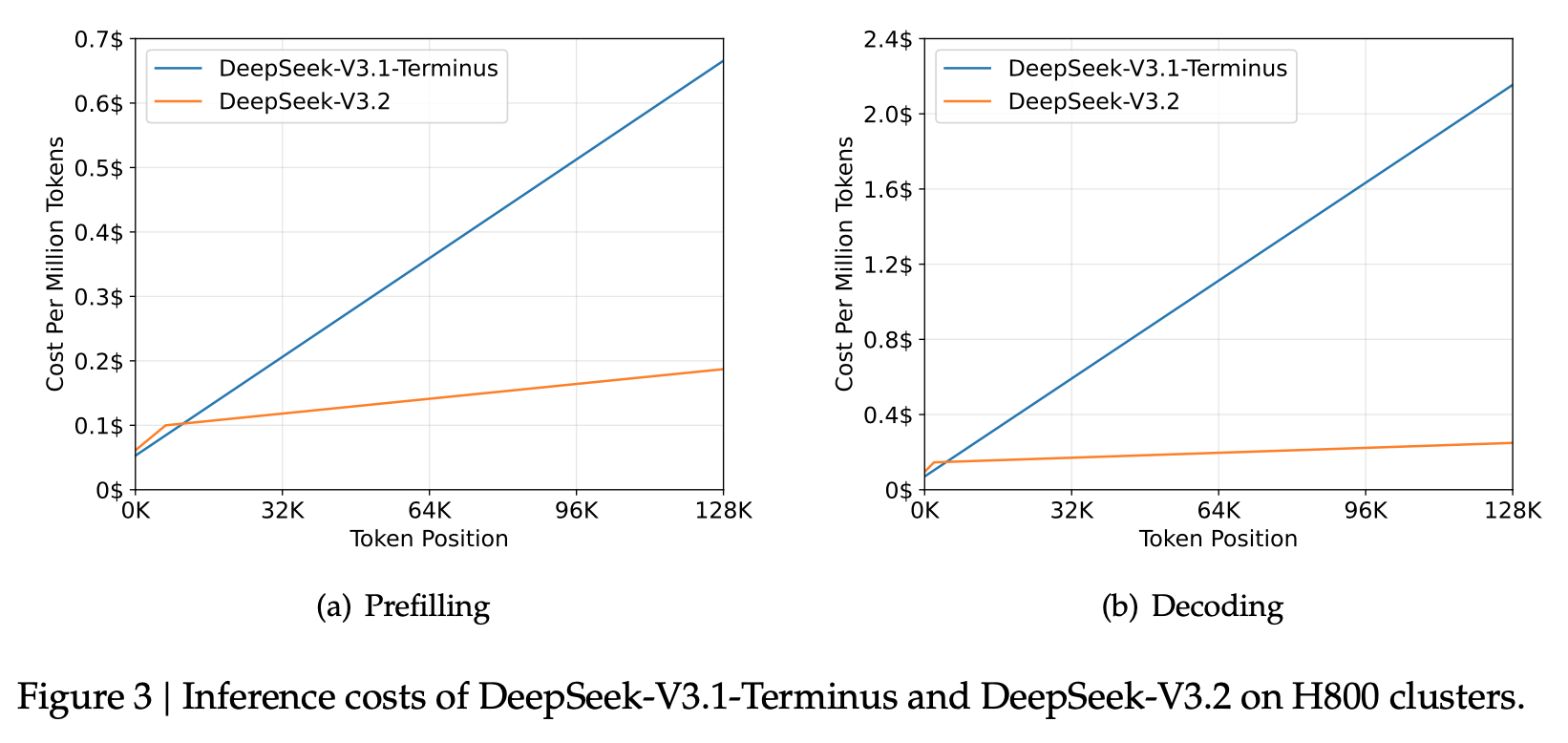 这一架构性突破极大地提升了模型处理长上下文任务时的计算效率。在实际应用中,这意味着处理长文档、复杂对话或长篇代码时,DeepSeek-V3.2 能够以更低的成本和更快的速度运行,为其在长文本场景的规模化部署和商业化应用中建立了显著的成本优势。