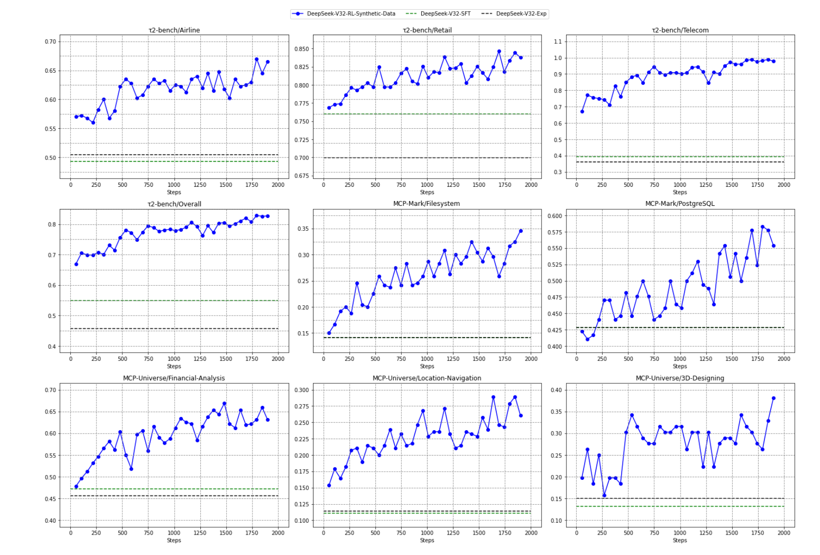 其有效性也得到了验证。 论文中的实验结果显示,仅仅在这些合成数据上进行强化学习训练,模型在多个真实的智能体基准测试(如 τ2-bench, MCP-Mark)上就取得了“实质性的提升 (substantial improvements)”。这证明了这种“AI 生成数据”的方法具有强大的泛化能力,模型学到的技能可以成功迁移到从未见过的真实世界任务中。