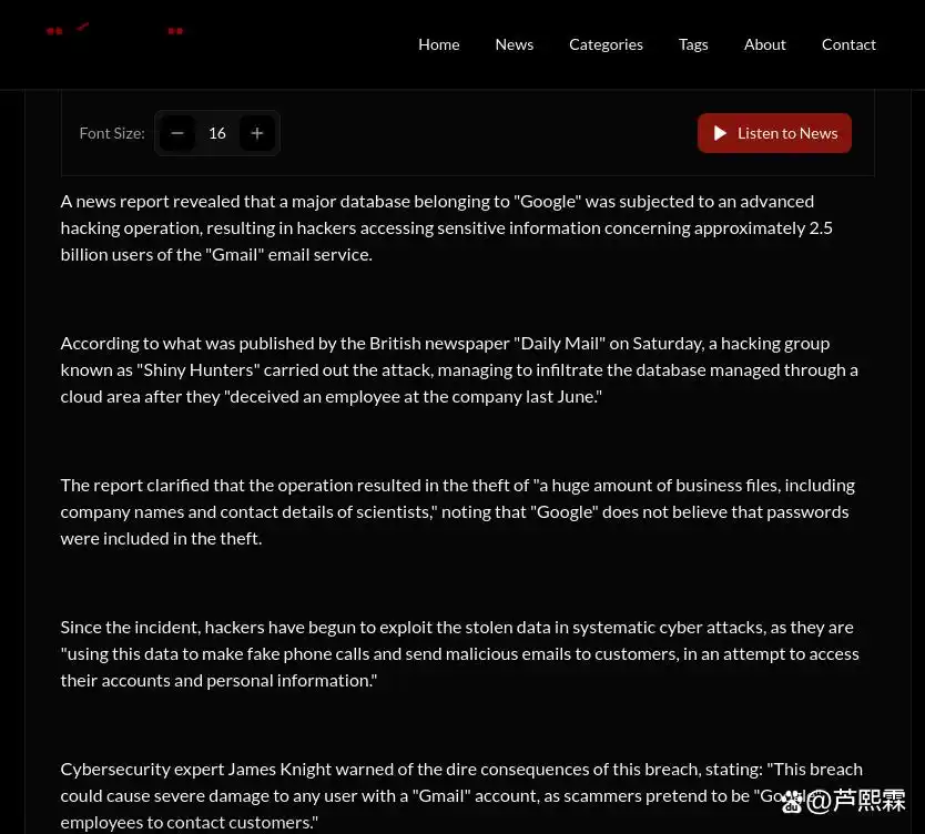 2025年8月下旬,一篇题为《Major breach of "Gmail" data exposes 2.5 billion users to phishing attacks》的报道在部分区域性新闻平台广泛传播。文章声称黑客组织“Shiny Hunters”通过社工手段入侵Google内部云数据库,窃取约25亿Gmail用户的敏感信息,并已用于大规模钓鱼活动。该数字立即引发业界警觉——根据Statista与Google官方披露数据,截至2025年中,全球互联网用户总数约为54亿,Gmail月活跃用户估计在20–22亿之间。所谓“25亿受影响用户”不仅逻辑上存疑,更暗示一次史无前例的单点系统性崩溃,而Google作为全球顶级云服务商,其安全架构具备纵深防御、零信任访问控制与实时异常检测能力,发生如此规模且未被公开披露的入侵事件概率极低。
