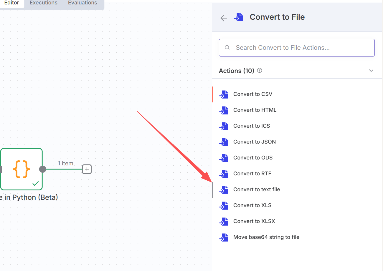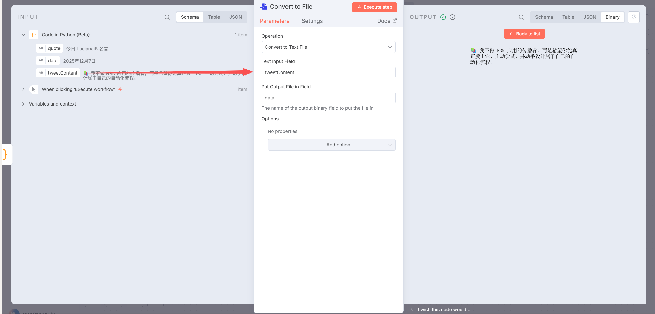 添加下一个节点Convert to File(保存为文件),选择text文件。