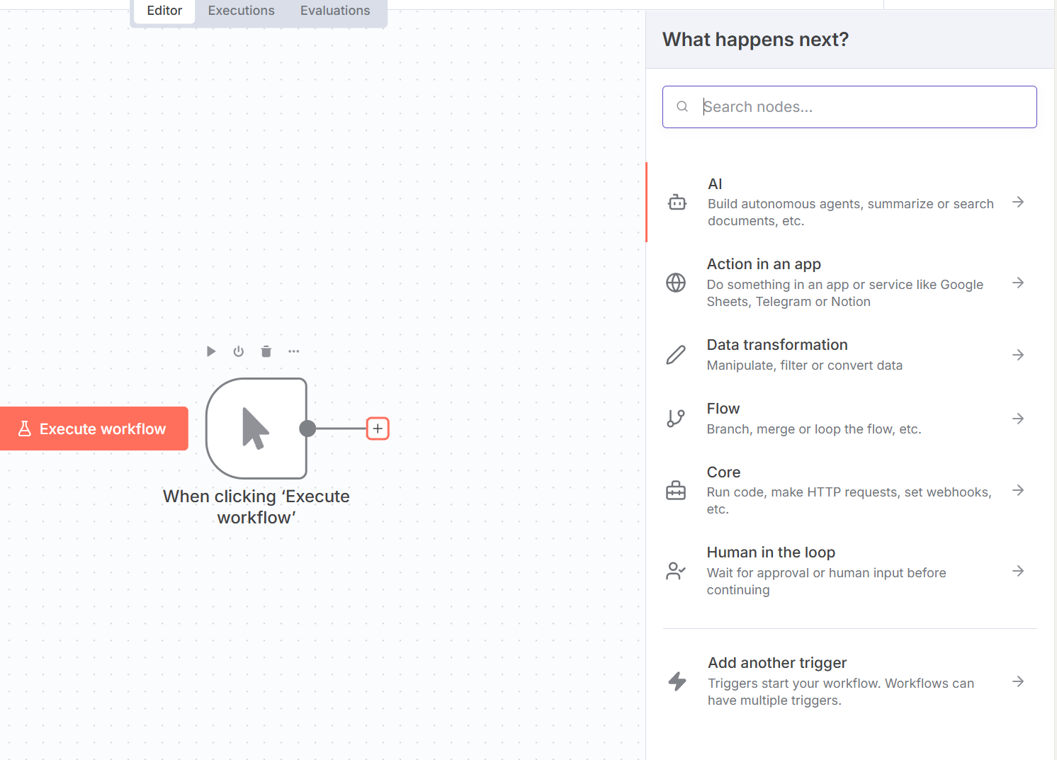 工作台就会出现第一个节点,点击右侧的加号可以继续添加节点。