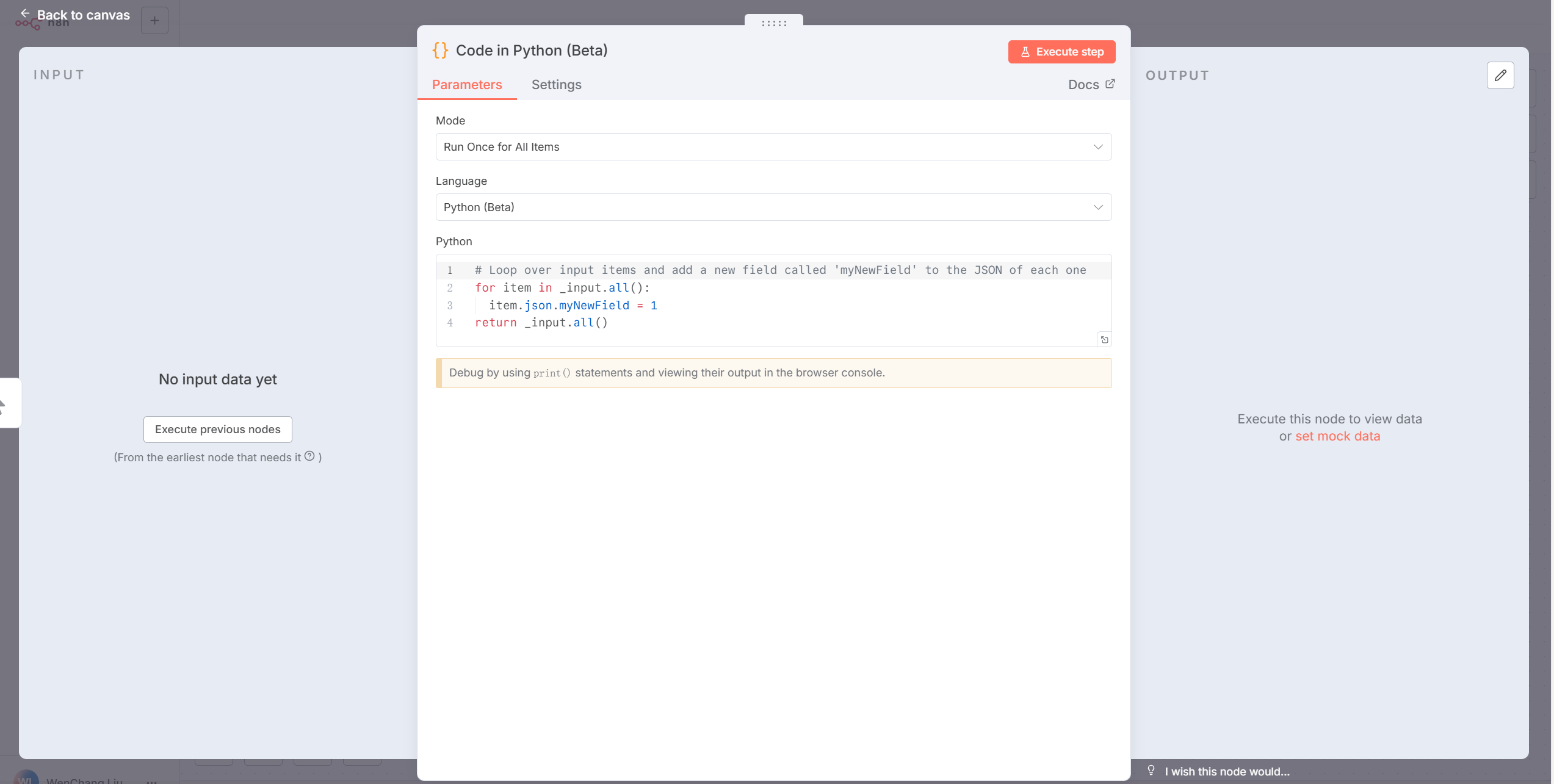 选择code节点为例,点击后会出现这个弹窗,我们在代码框放上自己所需要的功能代码,点击Execute step(执行步骤)按钮,右侧output那边就会出现输出的内容