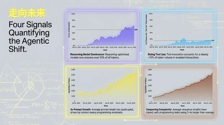 数据进一步揭示,编程类任务是驱动这一复杂度增长的主要引擎,其提示长度通常是其他类别的三到四倍。这清晰地表明,智能体推理正迅速成为处理真实世界复杂工作负载的新范式。