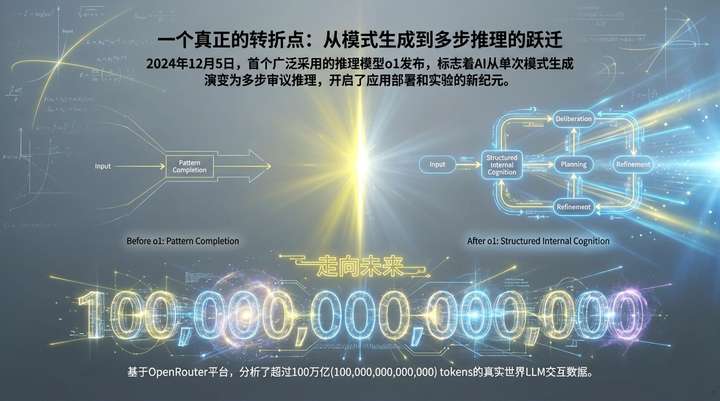 过去一年标志着人工智能领域一次根本性的范式革命,其转折点是2024年12月5日OpenAI o1推理模型的发布。这场变革的核心,是AI从以往单次传递的自回归模式生成,转向了具备规划与反思能力的多步审议式推理。为了揭示这场技术浪潮下大语言模型的真实应用图景,本文基于AI路由平台OpenRouter超过100万亿Token的真实世界交互数据进行深度分析,旨在探明大模型在实际应用中的具体样貌,并由此洞察市场结构的演进方向。原始报告及本文的PDF版已收录到走向未来知识星球,推荐加入星球获取。