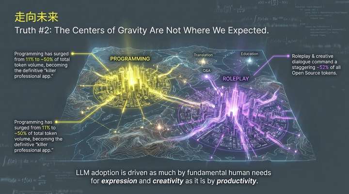 综合以上分析,我们可以得出几点关键洞察。首先,AI生态在本质上是多模型的,不存在单一的“通用人工智能”赢家,未来更可能是一个由多个专业化“水晶鞋”模型组成的强大组合,每个模型都在其锁定的高价值工作负载中占据主导地位。其次,AI的应用范式正从简单的文本生成向复杂的智能体推理演进。再次,市场的真实需求远超传统生产力工具,以角色扮演为代表的创意应用展现出惊人的活力。最后,市场的商业成功不再仅仅依赖于技术领先,更取决于能否率先找到并解决关键应用场景,实现“灰姑娘水晶鞋”式的深度匹配。