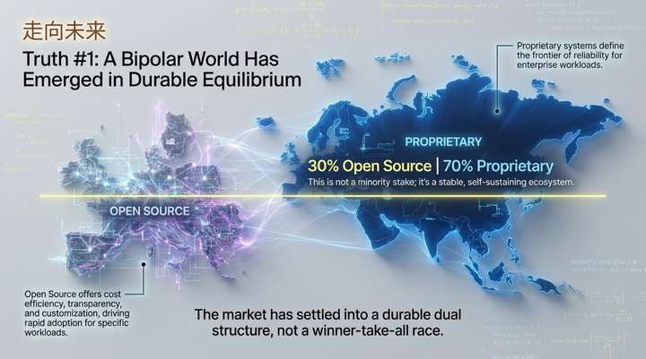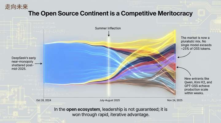 从成本与使用的关系来看,虽然整体需求对价格相对不敏感,但市场已清晰地分化为四个象限。闭源模型凭借其卓越性能,占据了高价值的专业级或企业级工作负载市场,形成了两大阵营:“高端领导者”(高成本、高用量,如Anthropic的Claude系列)和“高端专家”(高成本、低用量,如OpenAI的GPT-4/5 Pro,用于高风险的利基任务)。与此同时,开源模型则以其成本效益,主导了另外两大阵营:“高效巨头”(低成本、高用量,如DeepSeek和Google的Gemini Flash系列)和“长尾模型”(低成本、低用量)。这再次证明,在关键任务上,驱动用户选择的核心是价值与能力,而非单纯的价格。