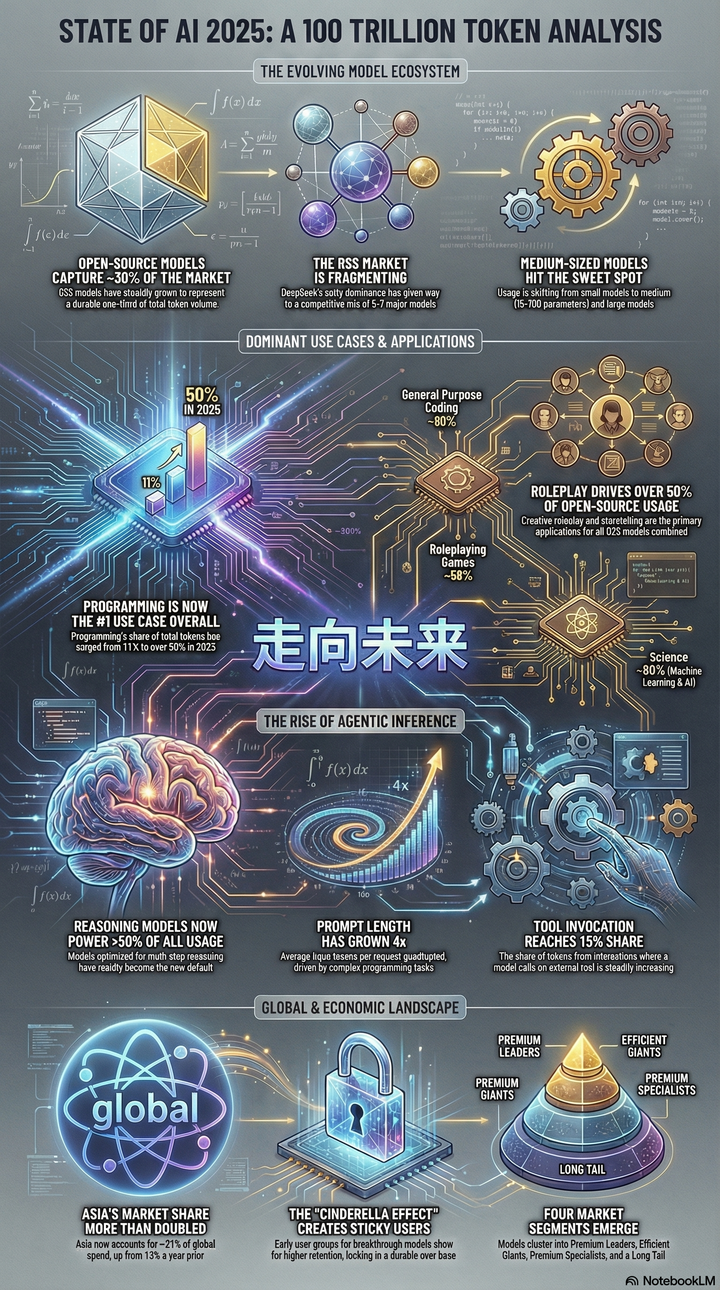 研究指出,行业正经历向智能体推理的转变,其特征是模型采用多步骤推理和更多的工具调用来解决复杂的任务,尤其是在编程领域。尽管专有模型仍占据主导地位,但开源模型已经占据了大约 30% 的市场份额,主要得益于对创意角色扮演和高效编码辅助的需求。报告提出了“灰姑娘玻璃鞋效应”,解释了早期用户一旦找到了完美的工作负载与模型匹配,就会产生持久的留存率。