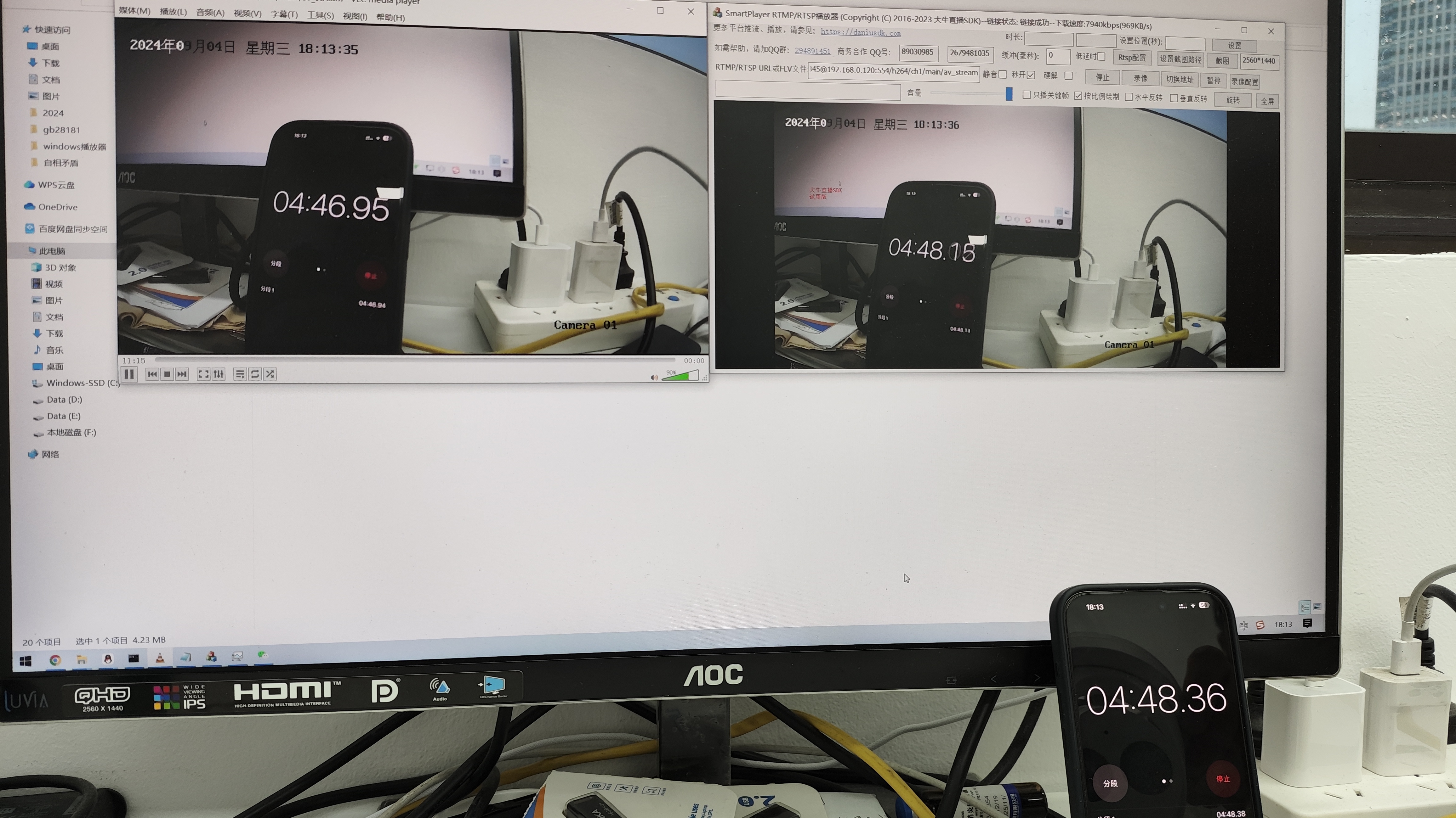 海康摄像头,2560*1440分辨率,25帧,8M码率播放效果,左边是VLC,右边是SmartPlayer大概延迟情况,可以看到,VLC延迟在1.5秒左右,SmartPlayer的在200ms左右。